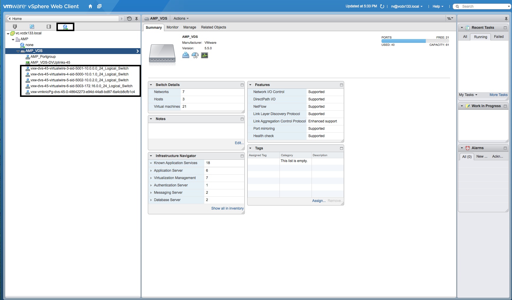 - If you access the “Network” tab from the “Home” screen and view the “Portgroups” of the “Virtual Distributed Switch”, you will notice the additional portgroups that were created by NSX Manager for each Logical Switch.