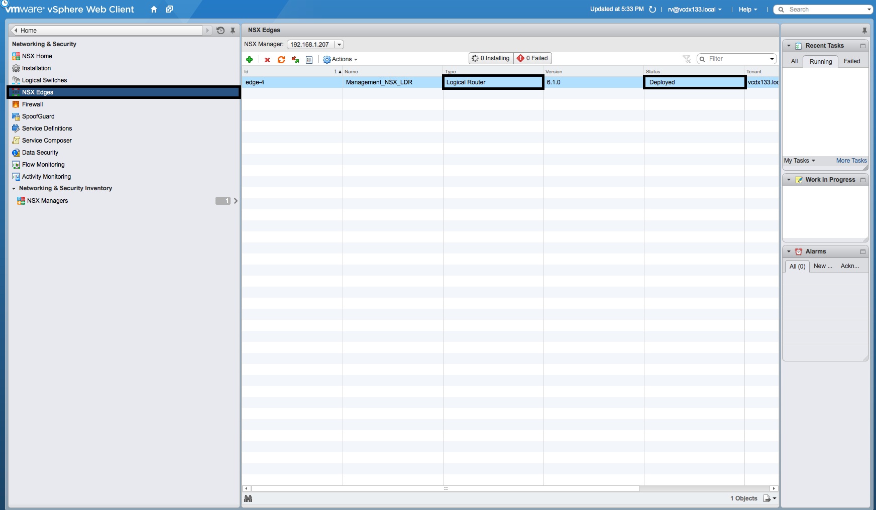- In the “NSX Edges” window, wait for the “Logical Router” “Status” to change from “Busy” to “Deployed”.