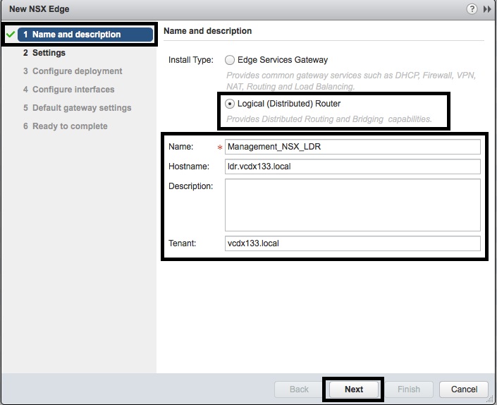 - In the “New NSX Edge” window, select the “Install Type” as “Logical (Distributed) Router” and enter the “Name”, “Hostname”, “Description” and “Tenant”. Then press the “Next” button.