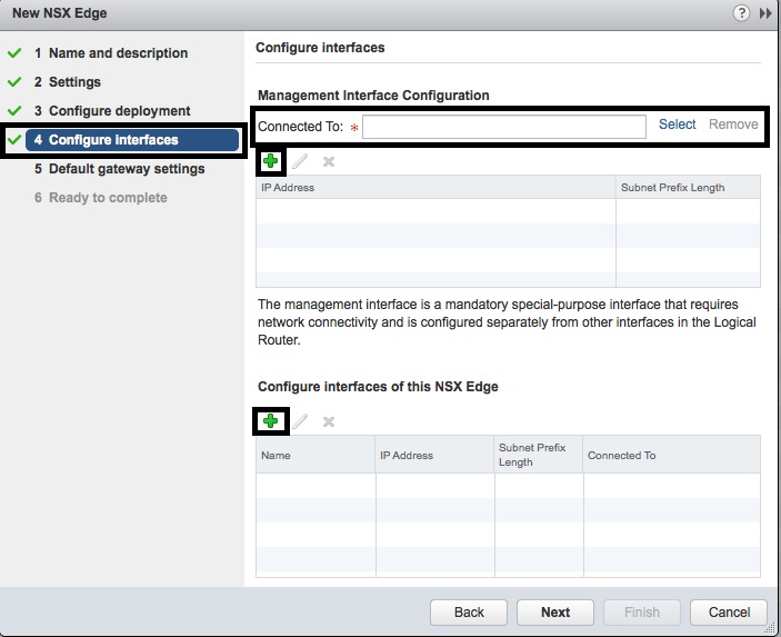 - In the “4 Configure Interfaces” screen, press the green “+” sign under “Configure interfaces for this NSX Edge”.