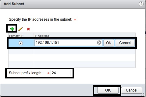 - In the “Add Subnet” window, pres the green “+” button and enter the Primary IP Address for the interface and set the “Subnet prefix length”. Then press “OK”.