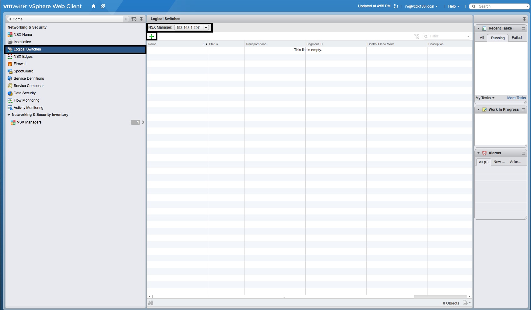 - Select “Logical Switches”, the correct “NSX Manager” IP Address and select the green “+” button.