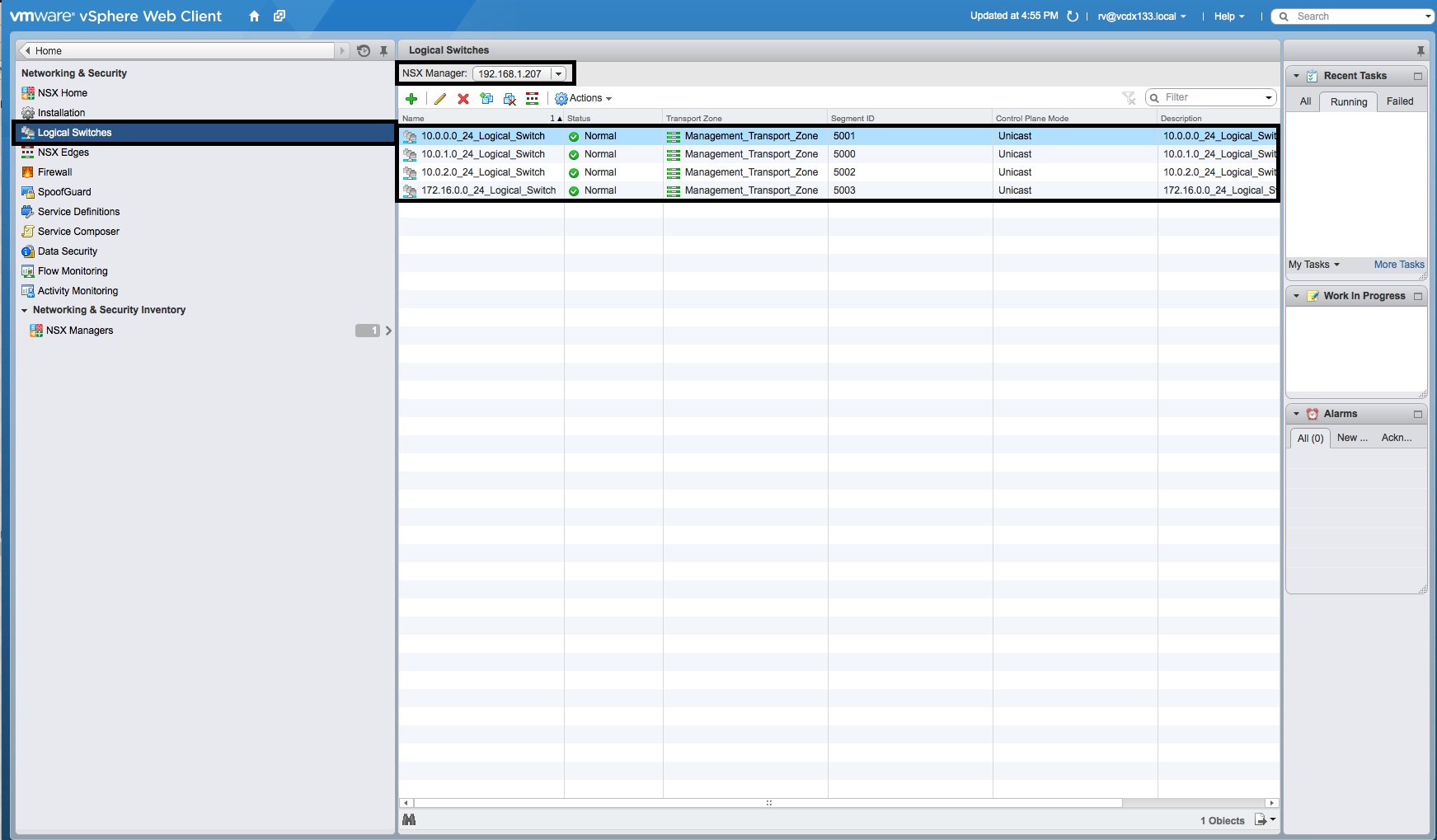 - Repeat this again, so that four Logical Switches appear in the list. Two will be used as “Internal” interfaces for the VMs (to DLR), the third will be the “Uplink” for the DLR to the Edge Services Gateway and the fourth will be the Management interface for the LDR.