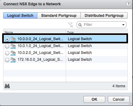 - In the “Connect NSX Edge to a Network” window, select the “Logical Switch” object and select the “Logical Switch” that will be used for DLR connectivity.
