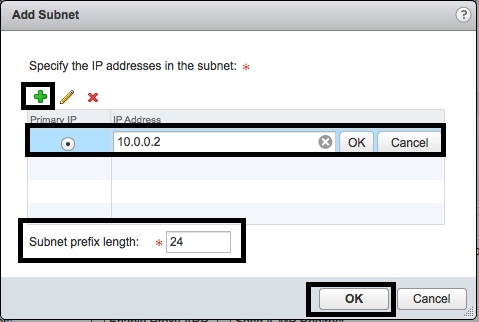 - In the “Add Subnet” window, pres the green “+” button and enter the Primary IP Address for the interface and set the “Subnet prefix length”. Then press “OK”.