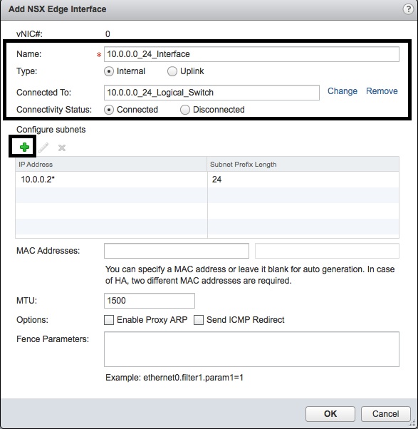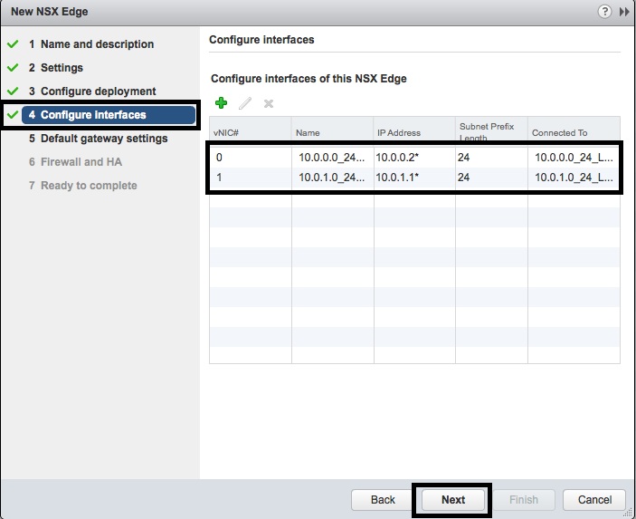 - In the “4 Configure Interfaces” screen, press the green “+” sign under “Configure interfaces for this NSX Edge”.