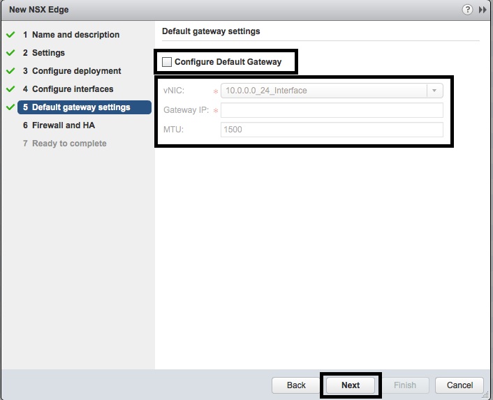 - In the “5 Default gateway settings” screen, tick “Configure Default Gateway”, select the vDS Portgroup, add the “Gateway IP” of the external network and press “Next”. The ESG will publish the default route via OSPF to the DLR.