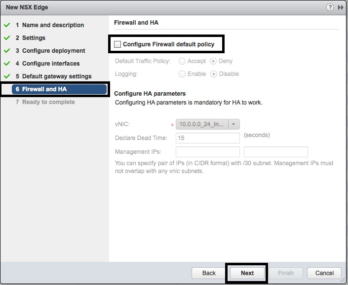 - In the “6 Firewall and HA” screen, leave “Configure Firewall default policy” disabled and press “Next”.
