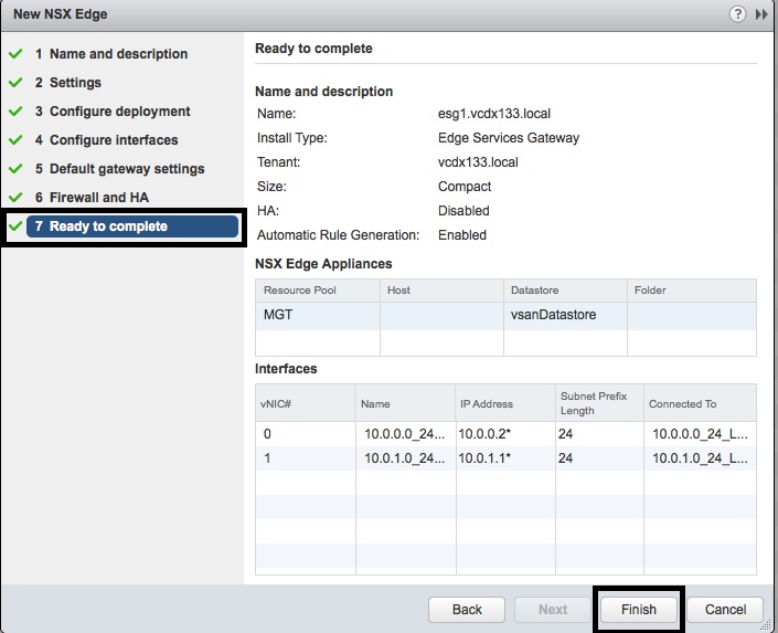 - Configure an Edge Services Gateway (ESG) that will allow the Distributed Logical Router (DLR) access to the Outside world.