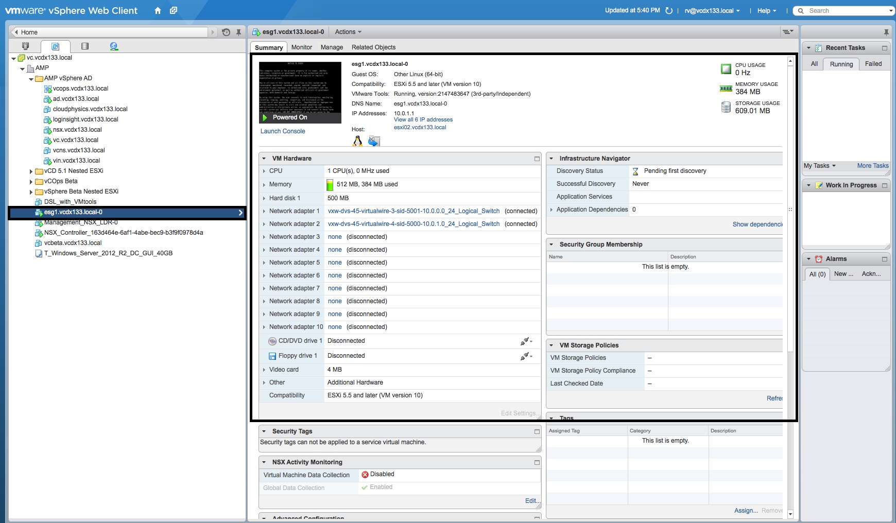 - From the VM Summary tab, you can see that the ESG is deployed with the default VM Hardware resources of 1 vCPU, 512MB RAM and 500MB Hard Disk. Also note that only a single Console session can exist concurrently and vSphere Infrastructure Navigator has no visibility of the ESG.