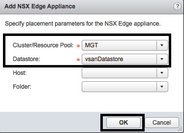 - In the “Add NSX Edge Appliance” window, select the “Cluster/Resource Pool” and the “Datastore” for the ESG. Then press “OK”.