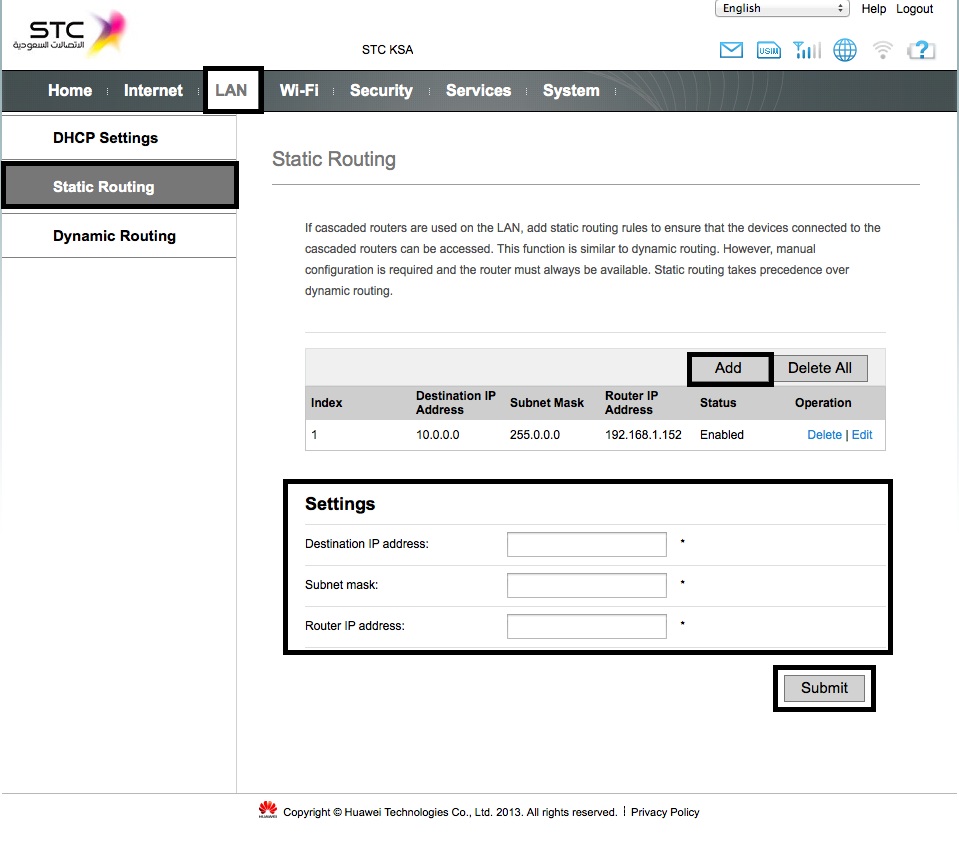- Login to the Huawei LTE 4G Router management interface with URL: http://<Gateway IP Address> and the default credentials “admin/admin”.