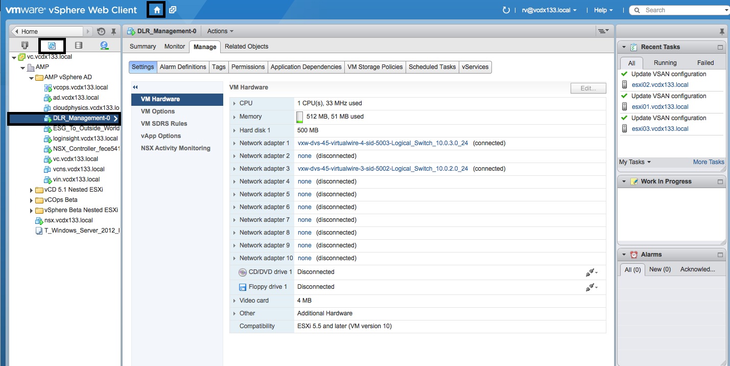 - Select “Home” and then the “VMs and Templates” icon to open the console to the “Distributed Logical Router” created in Part 3.