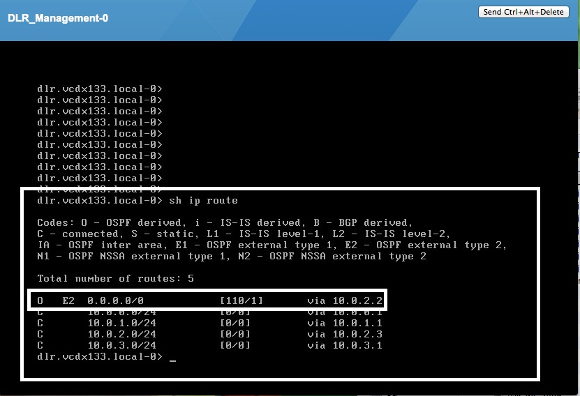 - Enter the command “show ip route” and press “Enter”. Verify that the default route “0.0.0.0” is listed with “O” (OSPF derived) and “E2” (OSPF External Type 2).