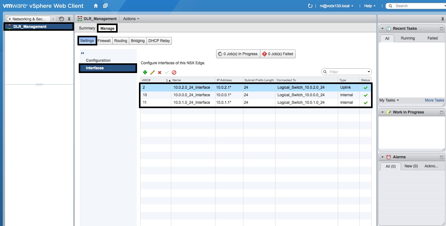 - In the “Logical Router” Management window, select the “Manage” object, the “Settings” tab and then the “Interfaces” object.