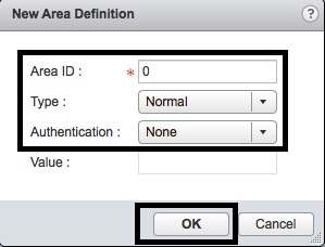 - In the “New Area Definition” window, enter “Area ID” “0”, “Type” “Normal”, “Authentication” “None” and then press the “OK” button.