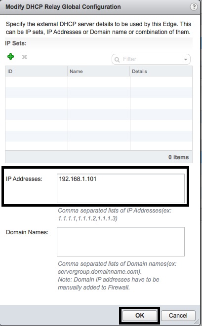 - In the “Add DHCP Relay Agent” window, select the “Internal” interface of the DLR from the “vNIC” drop-down list, select the matching “Gateway IP address” from the drop-down list and then press “OK”.