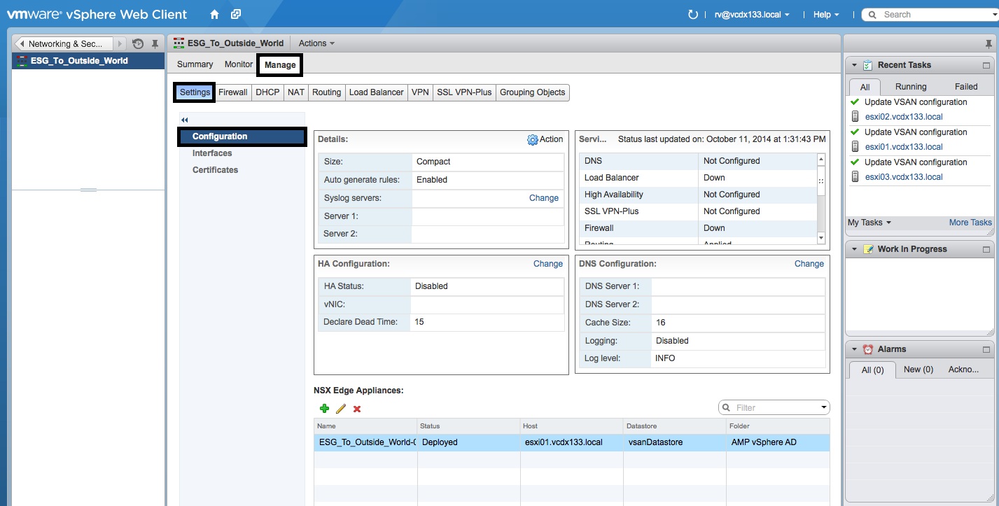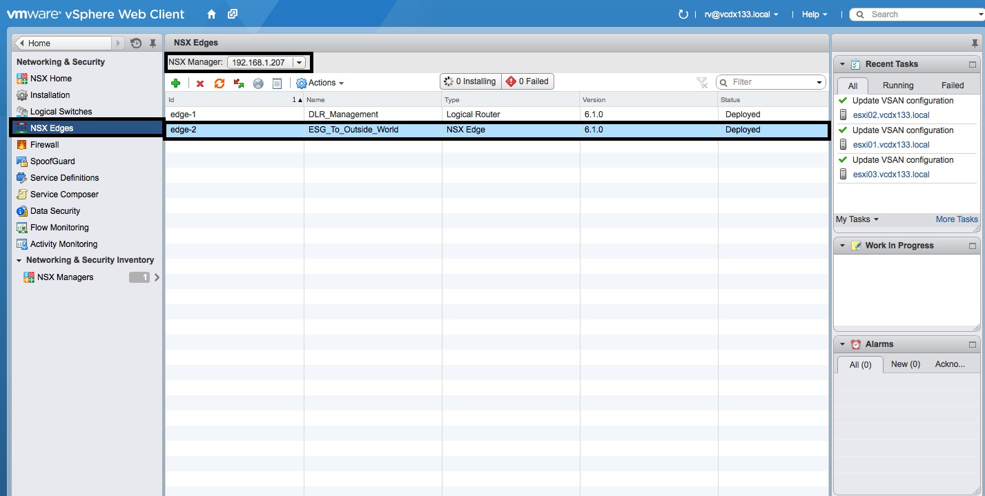 - Select “NSX Edges”, the correct “NSX Manager” IP Address and then double click the “NSX Edge” object deployed in Part 4.
