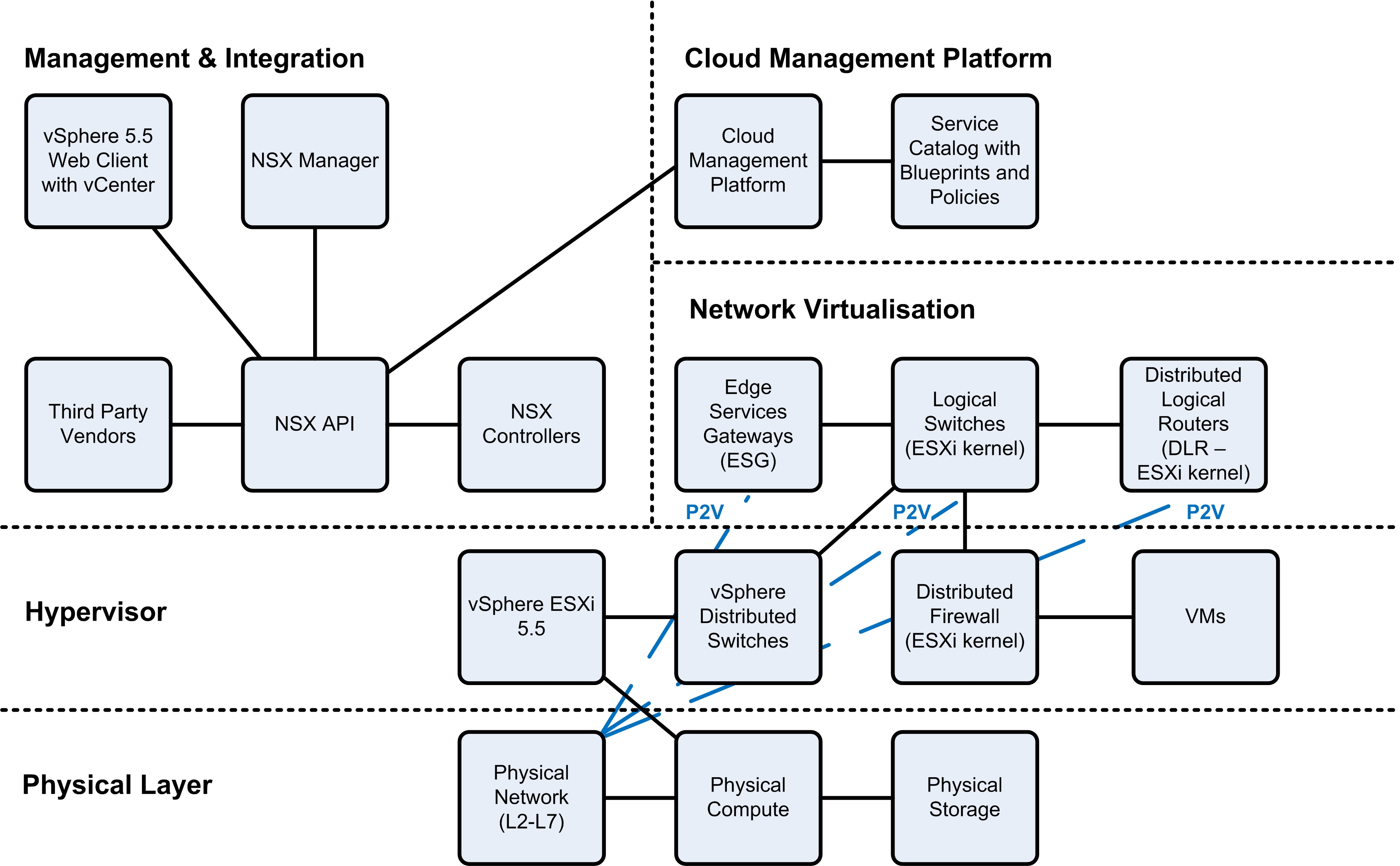 The diagram below illustrates the NSX architecture, complete with physical infrastructure. Note, storage virtualisation has been deliberately left out of the diagram since it is not in-scope. The “P2V” lines denote the possible NSX overlay to physical network integrations.