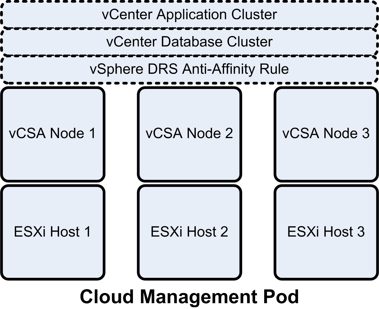 - vCSA supports 1+1 and 1+2 clustering scenarios (for 2 host and 3 host cloud management pods).