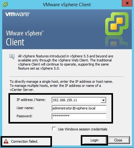 - Try connecting to vCenter Server 6.0 (after Step 3) and a “Error Connecting” message will appear (RC version only). GA version will connect to vCenter Server 6.0.