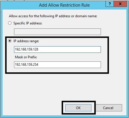 - Open the “IIS Manager” and select the “IP Address and Domain Restrictions” icon. Press the “Add Allow Entry” and create an “Add Allow Restriction Rule” for the DHCP range being used by the ESXi hosts.