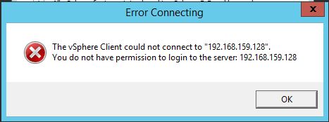 - From the vSphere Client – pressing the login button will report “Error Connecting – The vSphere Client could not connect to <IP address/FQDN>. You do not have permission to login to the server: <IP address/FQDN>” .