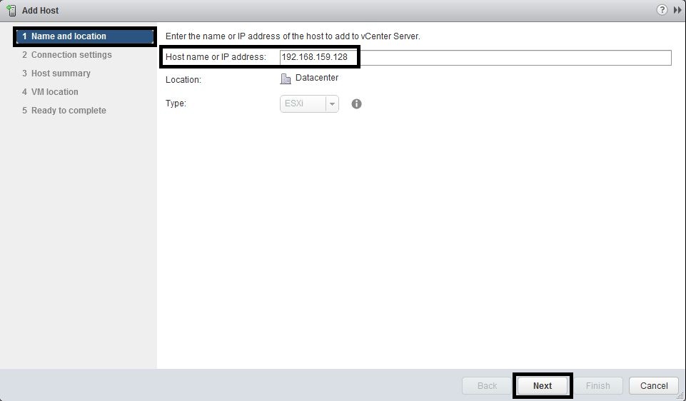 - In the “Name and location” window, enter the “Host name or IP address” and press “Next”.