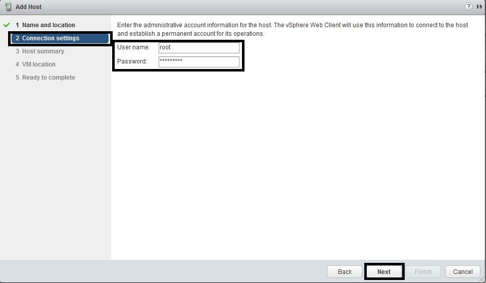 - In the “Connection settings” window, enter the “User name”/”Password” and press “Next”.