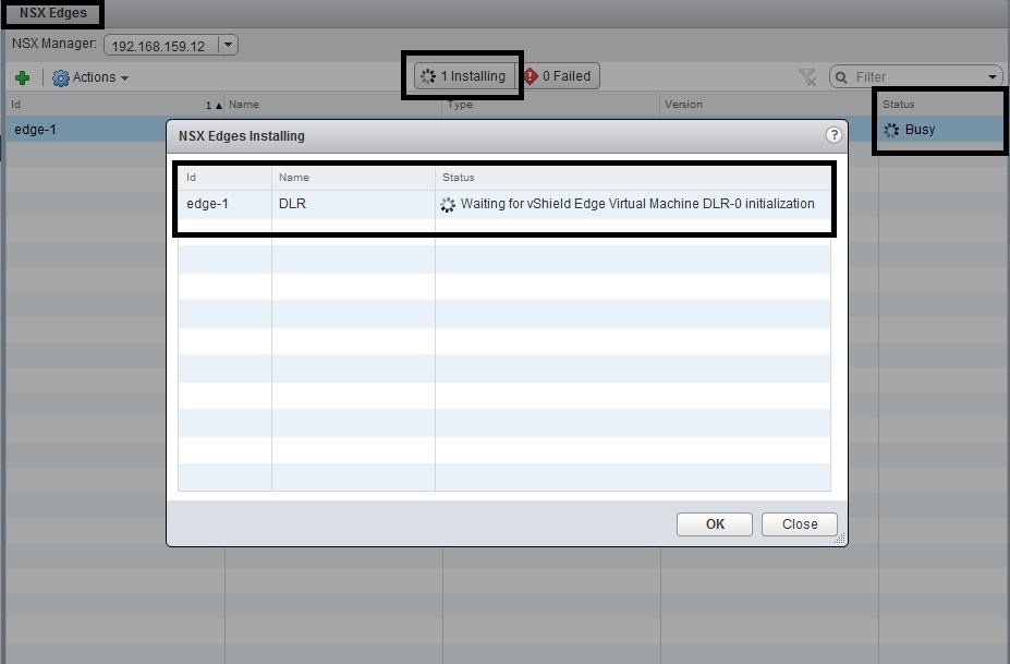 - NSX Edge Install status is “Waiting for vShield Edge Virtual Machine <DLR name> initialization”.