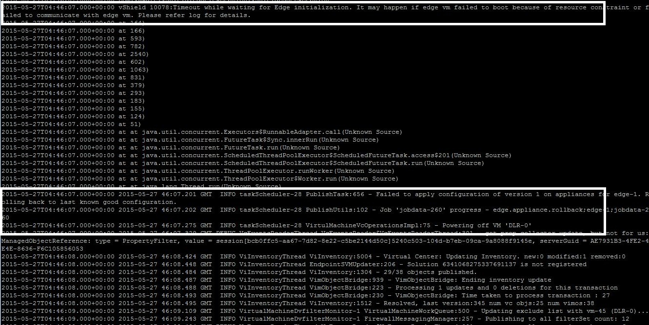 - NSX Manager log shows the message “Timeout while waiting for Edge initialization. It may happen if edge vm failed to boot because of resource constraint or failed to communicate with edge vm. Please refer to log for details”.