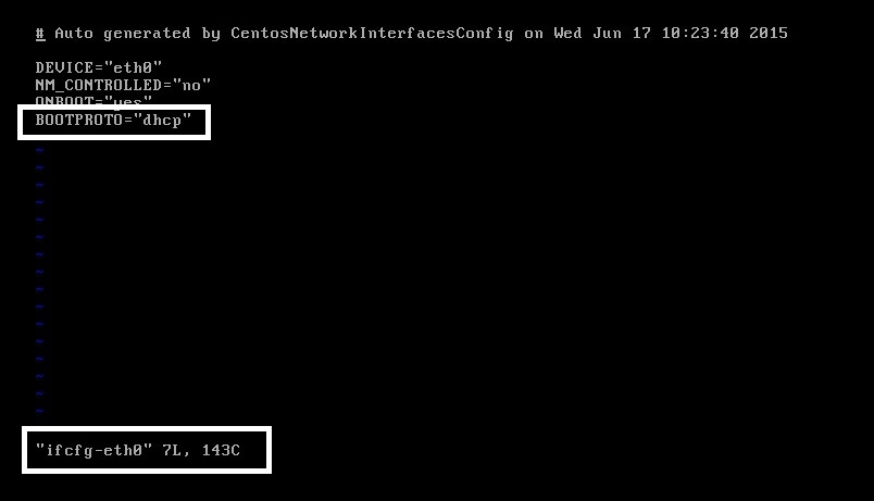 - Edit the file: “/etc/sysconfig/network-scripts/netconf/ifcfg-eth0” and modify/add “BOOTPROTO=”none”“, “NETMASK=”N.N.N.N”“, “IPADDR=”N.N.N.N”“, “GATEWAY=”N.N.N.N”” to the correct IP Address settings of the CVM.
