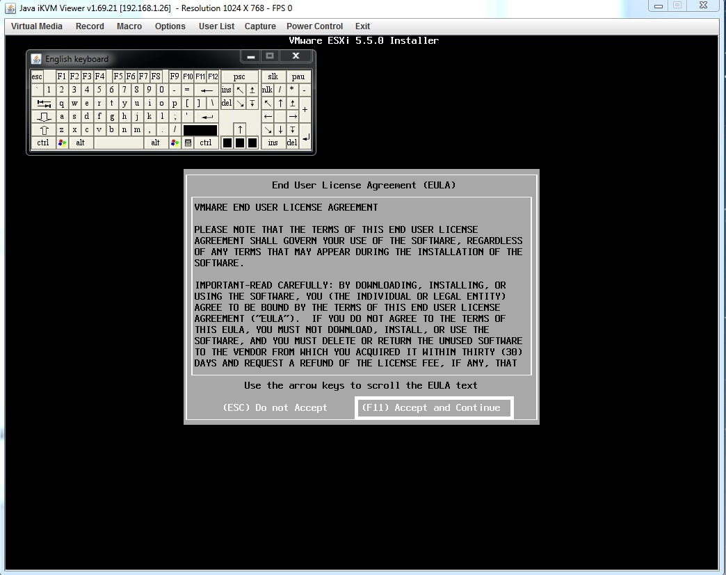 - Wait for the ESXi ISO image to boot and present the EULA screen. Press “F11” to accept and continue.