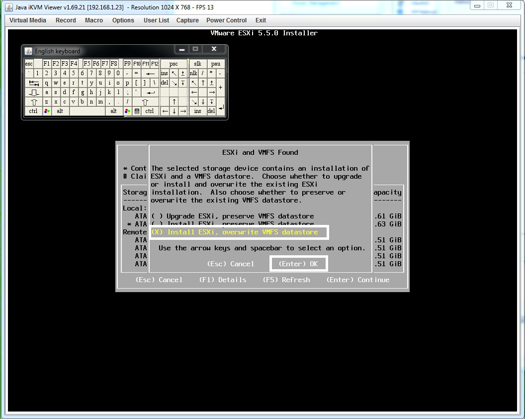 - If the “ESXi and VMFS Found” window appears, select “Install ESXi, overwrite VMFS datastore” and press “Enter”.