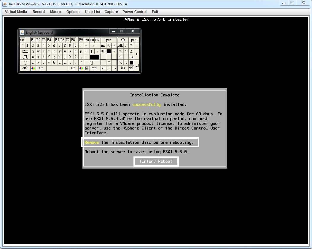 - From the previous section, you should have a Console window open with the ESXi ISO image mounted, ready to install.