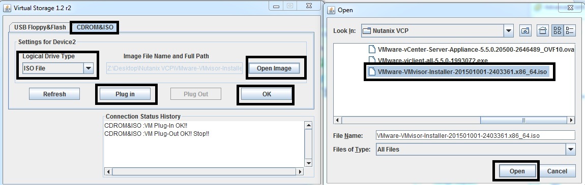 - In the Virtual Storage window, press “Plug out” and make sure the “Connection Status History” shows “Plug-Out OK” to unmount the ESXi ISO image.