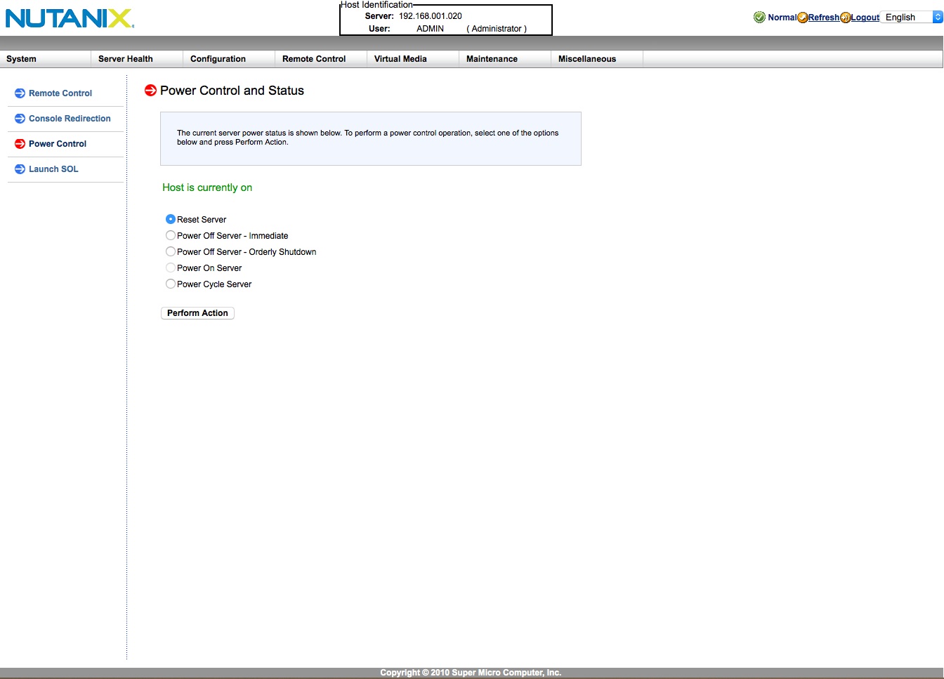 - At the Nutanix IPMI login screen, use the credentials “ADMIN/ADMIN” and press “Login”.
