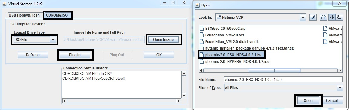 - Browse to the Phoenix ESXi ISO (phoenix-2.0_ESX_NOS-4.0.2.1.iso in this case) and press the “Open” button.
