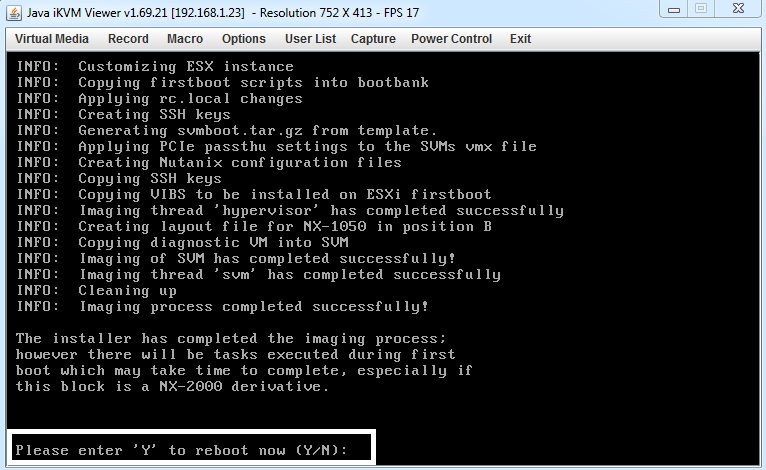 - Wait for the Nutanix Installation process to complete (“reboot now” message will appear).