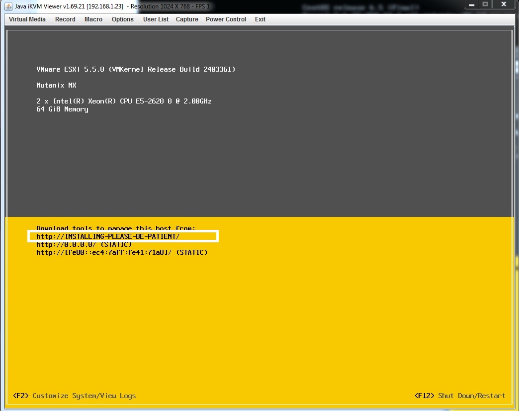 - After ESXi boots, you will see the message “INSTALLING-PLEASE-BE-PATIENT” on the Console screen (ESXi DCUI). This is a Nutanix VIB executing the first boot installation script, configuring ESXi and registering the CVM vmx file.