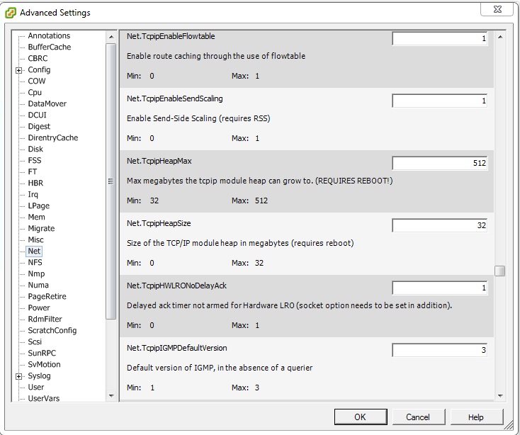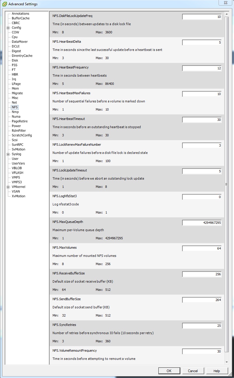 - Advanced Software Settings for NFS (Net.TcpipHeapMax, Net.TcpipHeapSize, NFS.MaxVolumes, etc.)