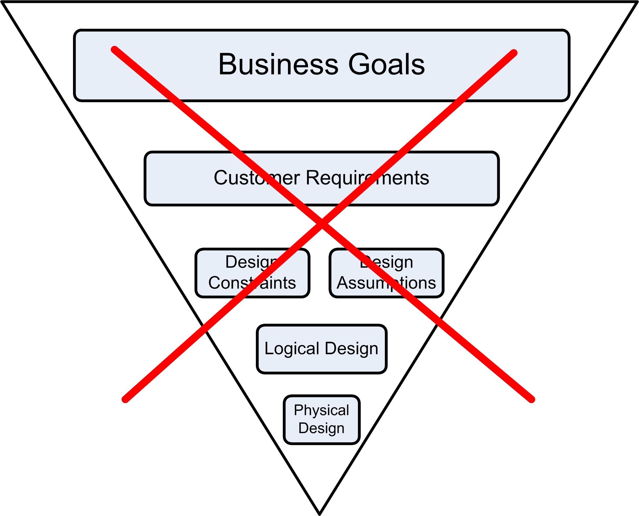 “The Inverted Pyramid” – you have hundreds of Business Goals, Customer Requirements, Design Constraints and Design Assumptions in the Conceptual Model, but only a few Logical and Physical Design Decisions. There is no way this design will meet the requirements of your customer.