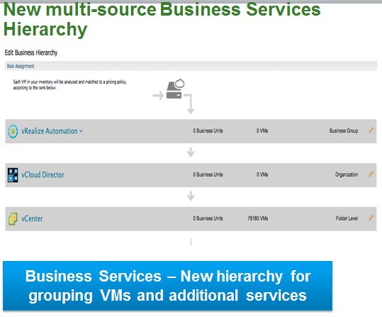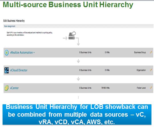 - Multi-source Business Unit Hierarchy (vCenter Server, vRA, vCD, vCA, AWS, etc.)