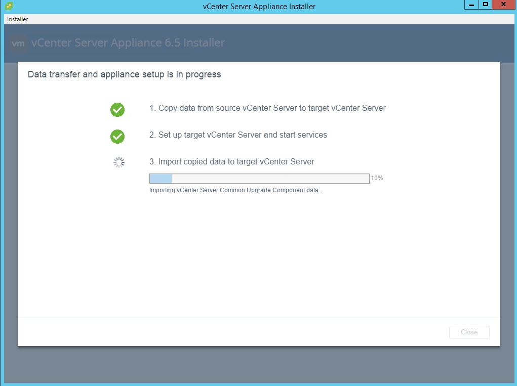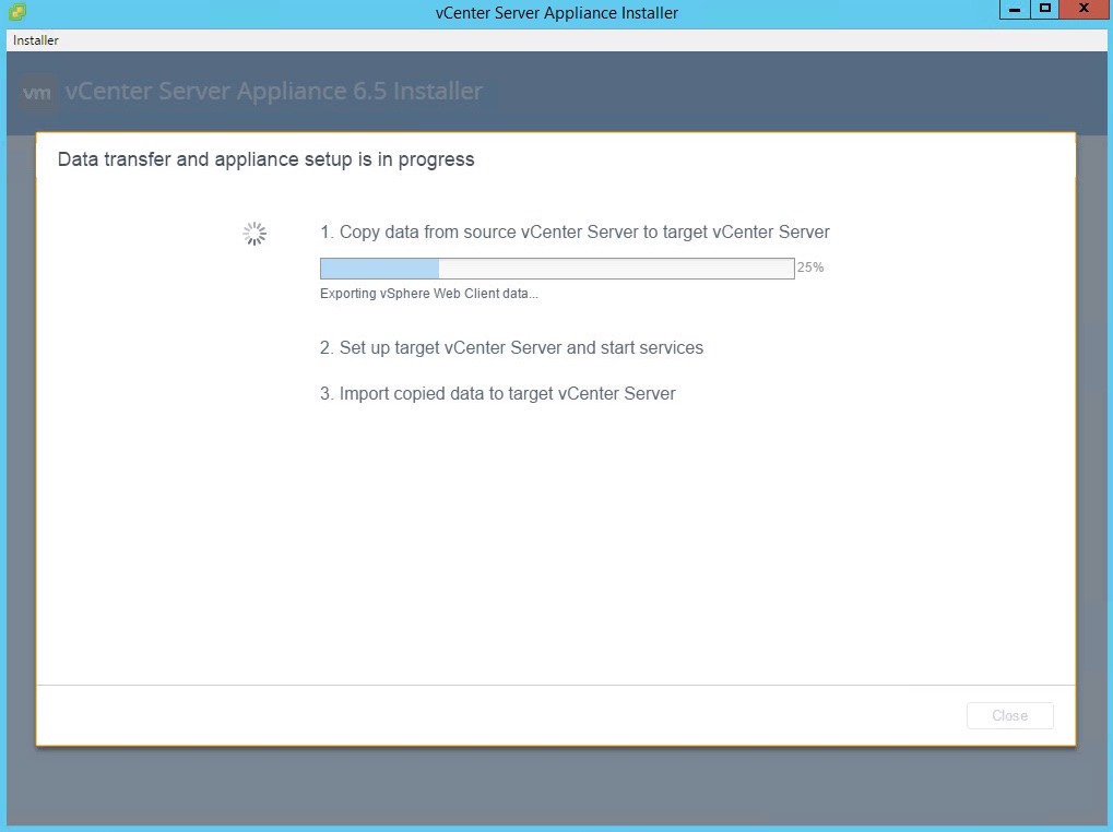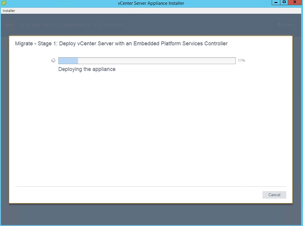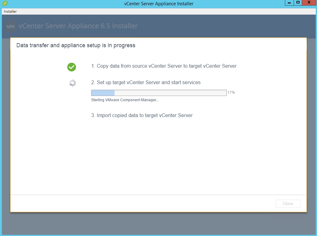 - The three stage process of upgrading/migrating to the vCenter Server Appliance 6.5 will begin. Be patient, this takes 45 minutes or more.