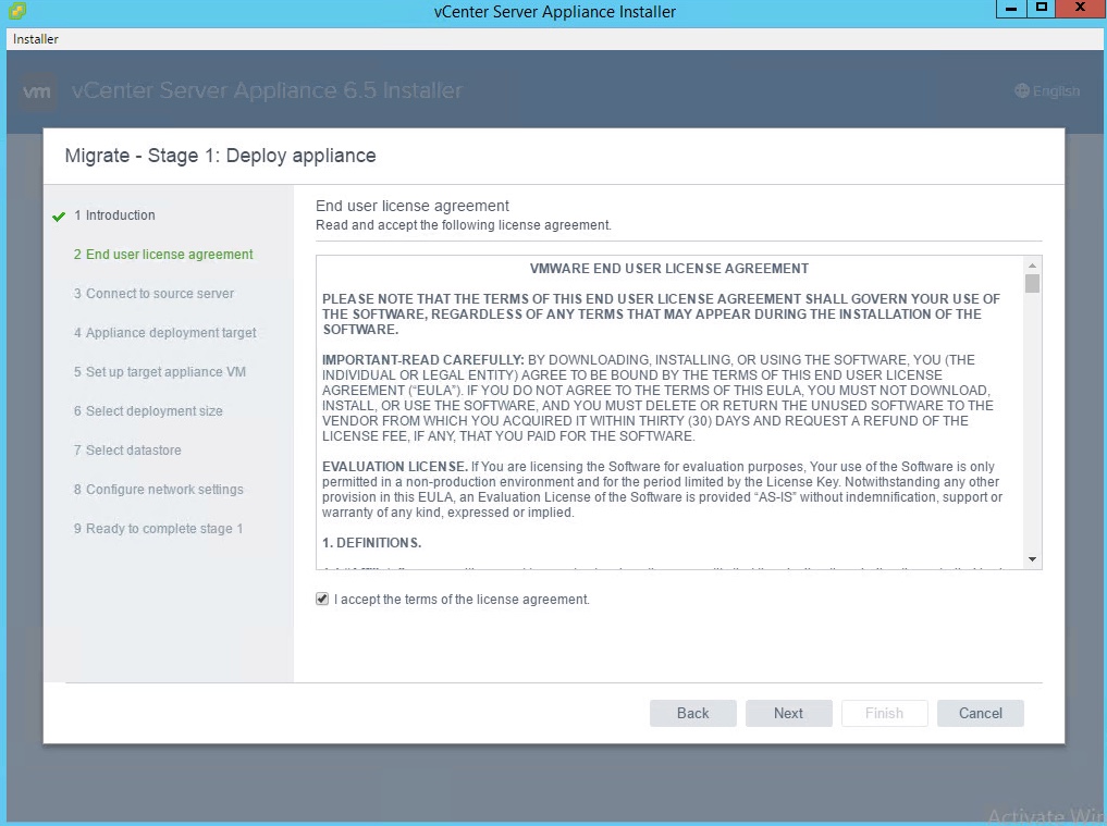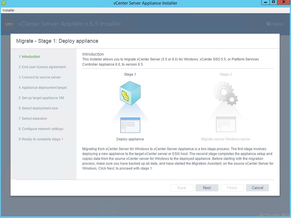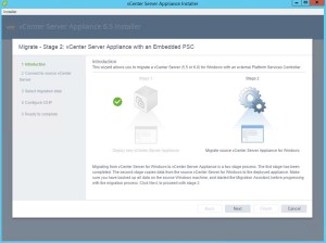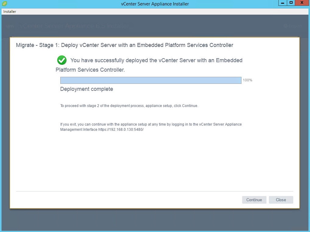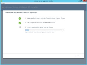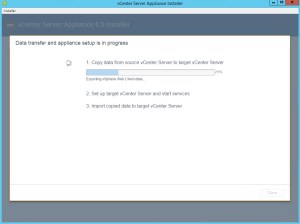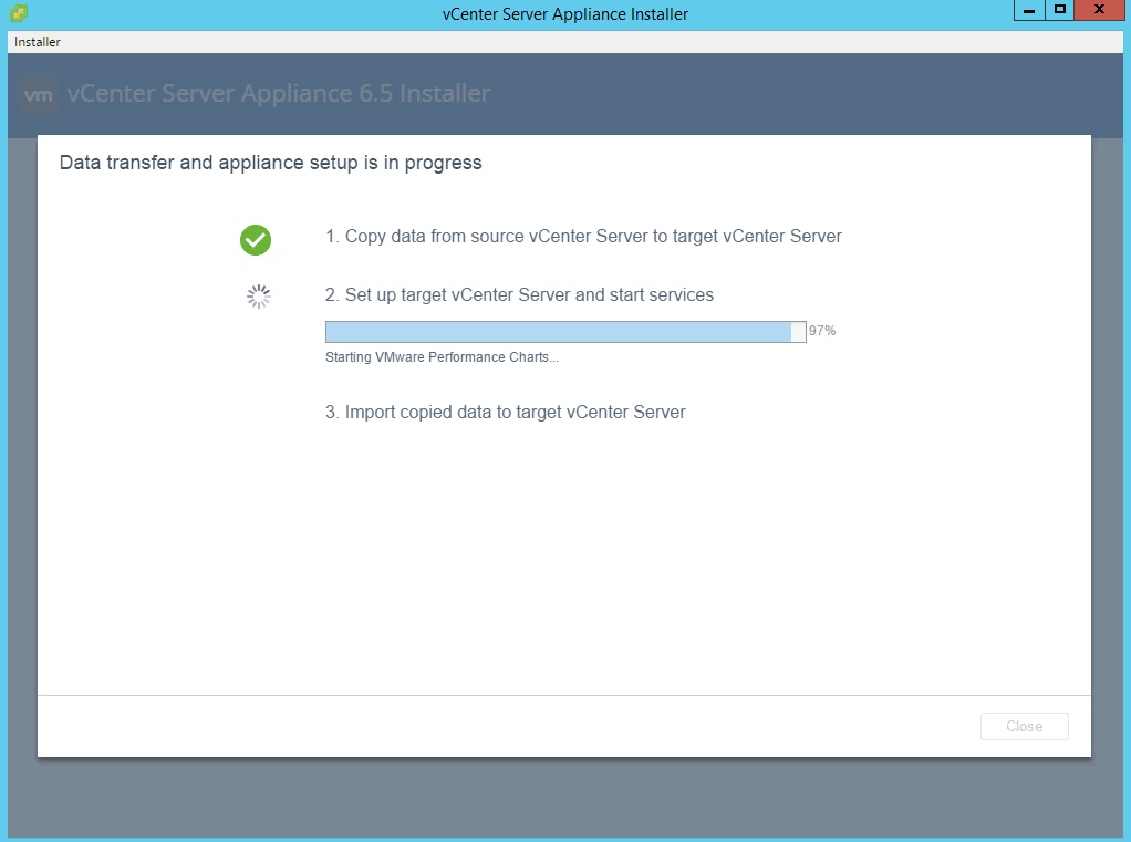 - The three stage process of upgrading/migrating to the vCenter Server Appliance 6.5 will begin. Be patient, this takes 45 minutes or more.