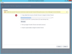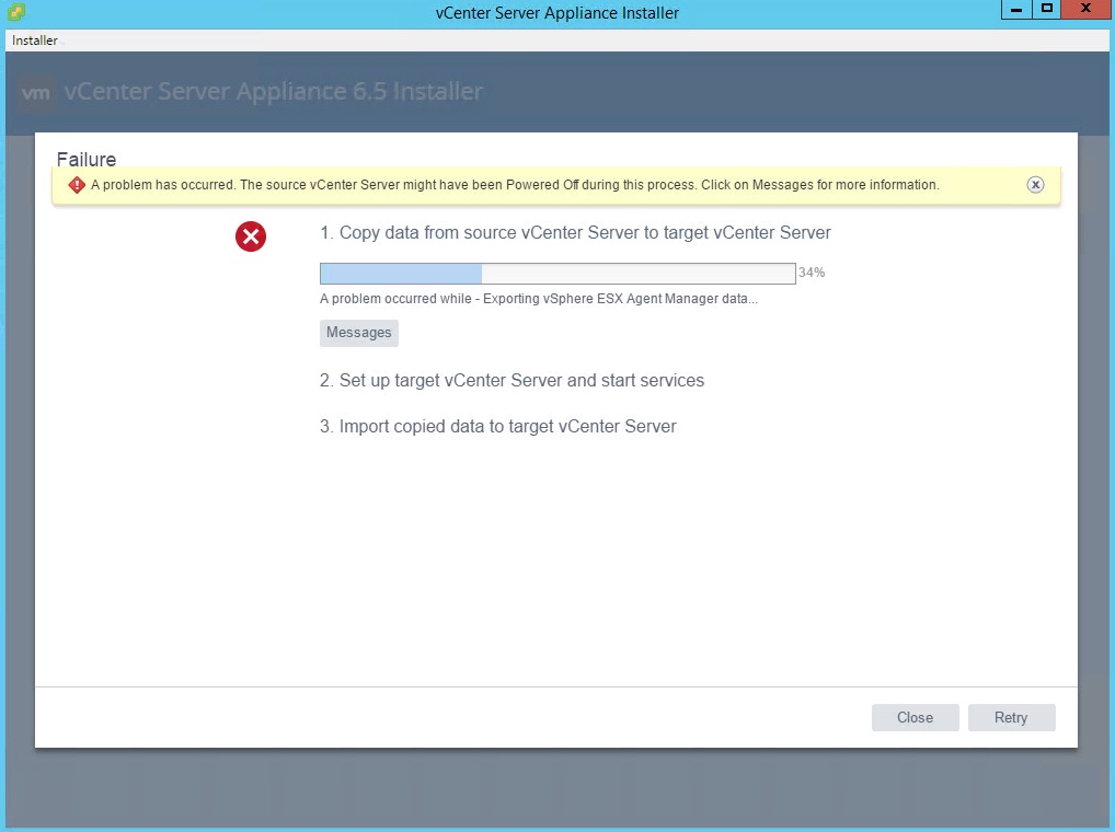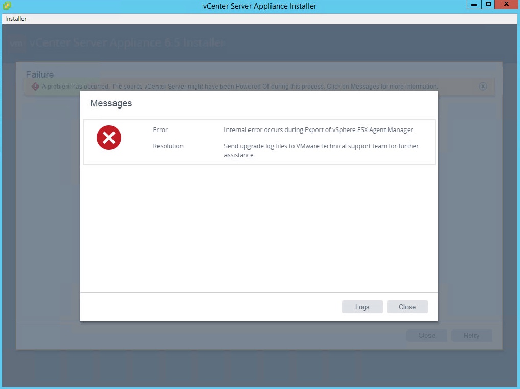 WARNING – Currently, migrating from vCenter Server 6.0 U3 on Windows (must be U2 variant or earlier) to vCSA 6.5 is not supported. If you try this the upgrade will fail with the error message “A problem has occurred. The source vCenter Server might have been Powered Off during this process. Click on Messages for more information.” and the detailed error message “Internal error occurs during Export of vSphere ESX Agent Manager”. Check the VMware Product Interoperability Matrices – Upgrade Path for the latest information.