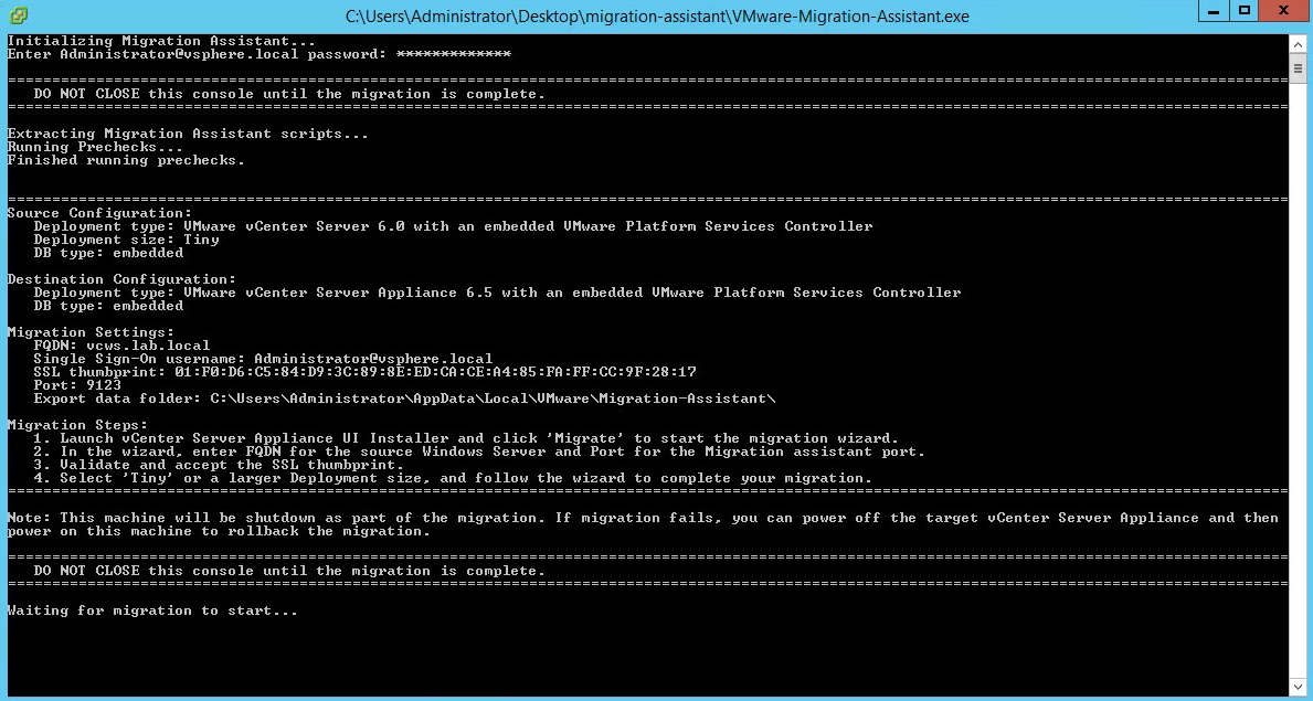 - Verify that the “Waiting for migration to start…” message appears and then minimize the console.
