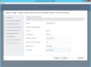 - In the “Configure network settings” window, select the Network (Portgroup must be ephemeral or vSS), IPv4/IPv6, IP assignment, temporary IP address, Subnet mask, default gateway, DNS servers and press “Next”.