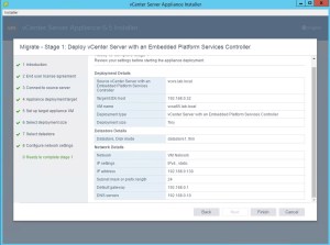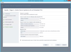 - In the “Ready to complete” window, review the settings, acknowledge the “source vCenter Server” backup statement and press “Finish”.