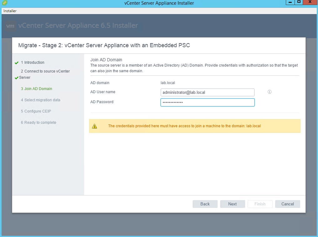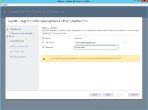 - In the “Join AD Domain” window, enter the AD credentials to join the vCSA instance to the AD domain and press “Next”.